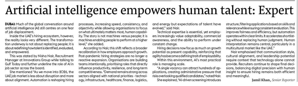 In this exclusive interview with Gulf Today, Nisha Nair, Recruitment Manager at Innovations Group, shares how automation is reshaping hiring processes, increasing speed, consistency, and objectivity while allowing organisations to focus on what ultimately matters most, human capability.