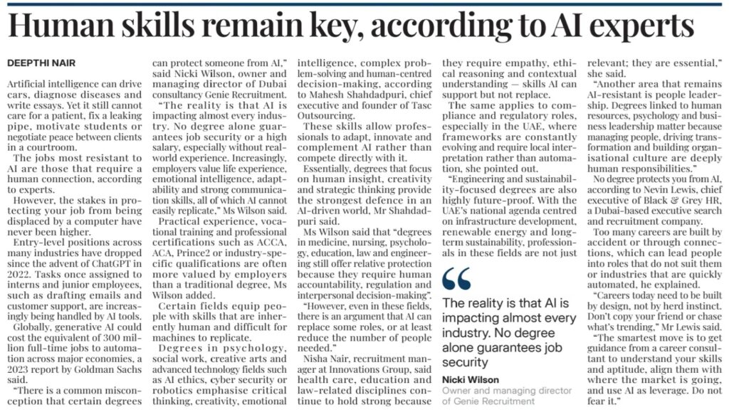 In this The National feature, Nisha Nair, Recruitment Manager at Innovations Group, explains why careers rooted in empathy, judgment and real-world decision-making, such as healthcare, education and law, are more resilient to AI disruption. She highlights how the UAE job market is shifting, with professionals needing adaptability and alignment to national priorities while leveraging AI as a complement rather than a threat.