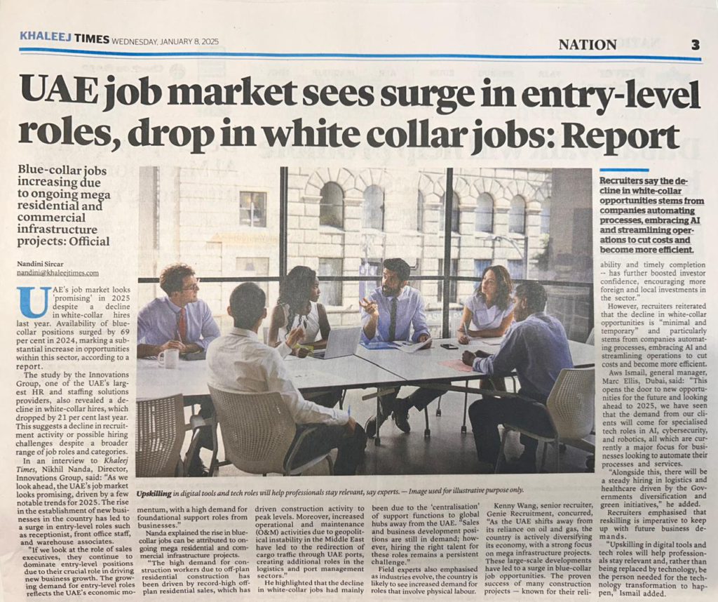 As per an independent report by Innovations Group, there is a growing demand for entry-level roles reflects the UAE’s economic momentum with a high demand for foundational support roles from businesses.